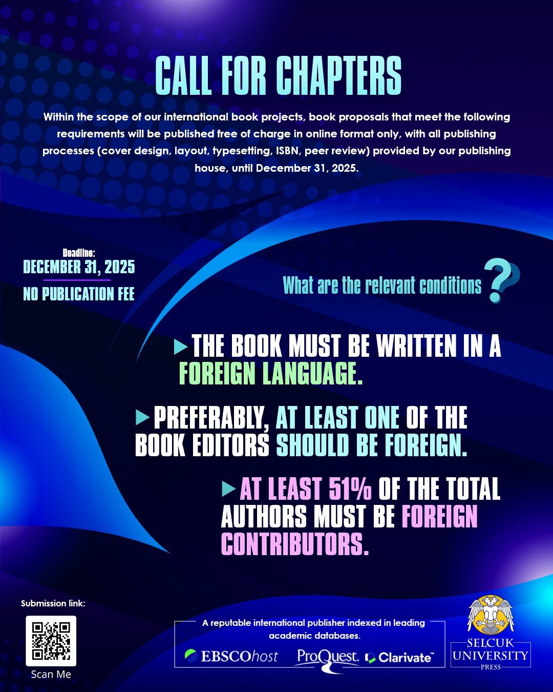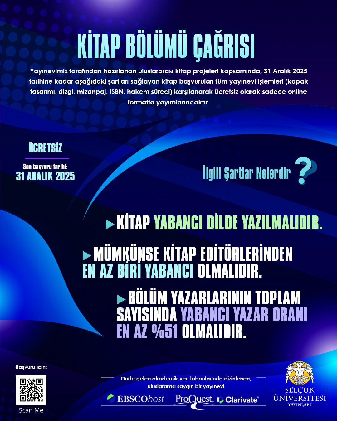 2025-08-20 tarihinde gönderildiYayınevimize başvurusu yapılmış ve yayımlama süreçleri devam eden bölümlü kitaplarımıza ait çağrı afişleri aşağıda yer almaktadır. Her bir kitap için editör iletişim bilgileri ilgili afiş üzerinde bulunmaktadır. Bu kitaplarda bölüm yazmak isteyen araştırmacılar, doğrudan kitap editörleri ile iletişime geçerek bu kitaplarda bölüm yazma taleplerini iletebilir ya da koordinatörlüğümüz ile iletişime geçerek kendi oluşturacakları ekipler ile farklı bölümlü kitap çalışmaları başlatabilir.